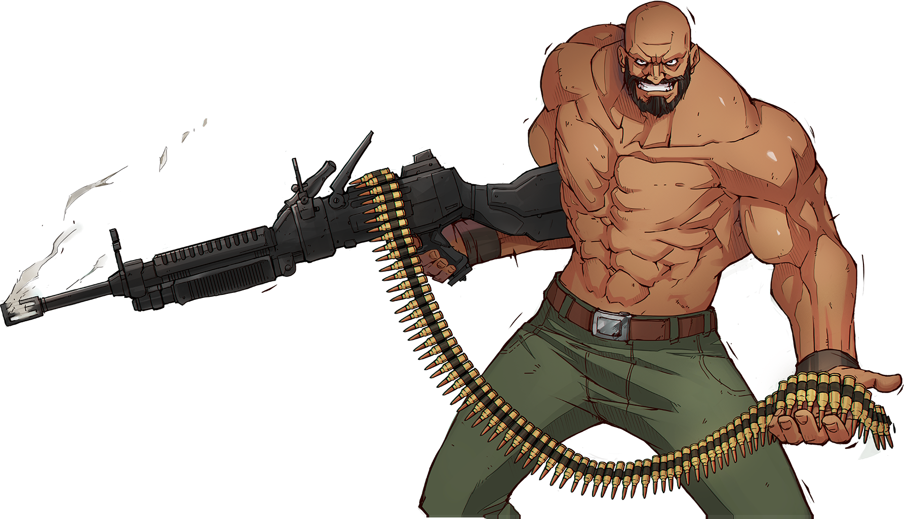 His design may have been based on Sylvester Stallone's depiction of the titular hero John Rambo, due to him appearing shirtless with rippling muscles and armed with a heavy machine gun similar to the character in Rambo: First Blood Part II.